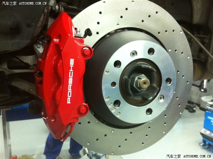 和朋友们跑了几次北京金港赛道后发现原车的刹车系统在赛道中连续暴踩后容易出现热衰竭导致刹不住,于是决定升级刹车系统。原车的刹车卡钳是保时捷普通的前4后4 ,这次升级成保时捷 911Turbo 的前6后4,其实这套红色的卡钳就是著名的刹车大厂BREMBO代工的。