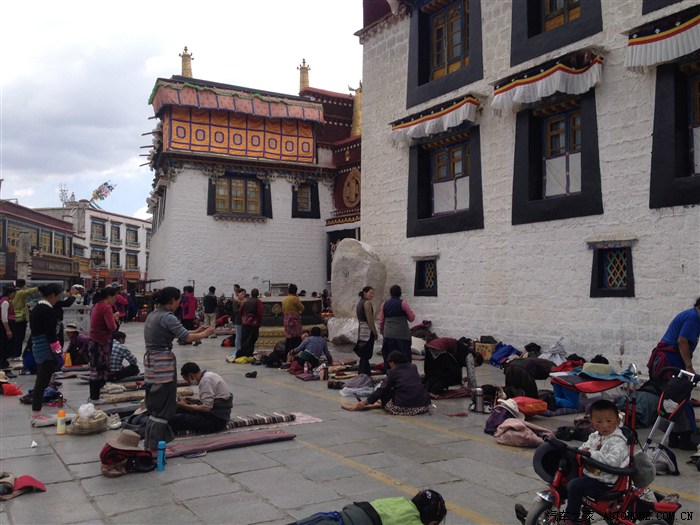 一路上大家不要惊讶 会看到许多这样的虔诚藏民。三步一跪拜的形式去大昭寺。条件好点的会有小三轮车在前面等他 每次跪拜到哪就在哪里休息。