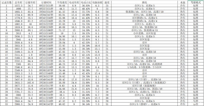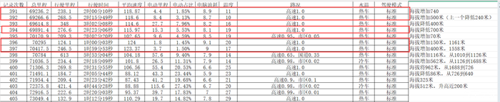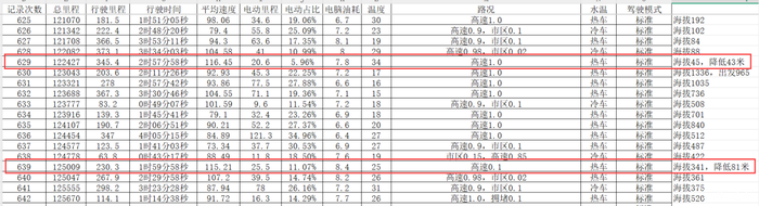 再看394组数据,平均速度接近116km/h,这段路程的海拔虽然降低了700米,对油耗降低有一定帮助,但最终海拔也接近1000米,比汽车之家测试的海拔还是高了接近1000米。最终表显油耗只有8.1L,说明平均速度降低、海拔降低对油耗影响很明显。