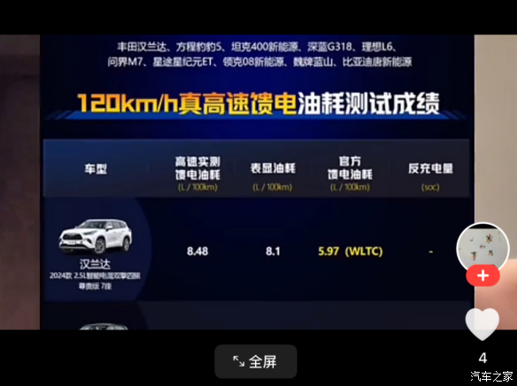 先看之前的测试结果。30度气温,平均速度120km/h,速度误差正负2km/h以内,连续行驶2小时,也就是240公里。汉兰达混动是所有测试车型中唯一的油电混动HEV,其余9款为插混PHEV或增程REEV车型,而汉兰达Hybrid也是十款测试车中,油耗最低的,实测8.48L。所以,背着大电池的插混PHEV或增程REEV车型,根本不擅长高速。