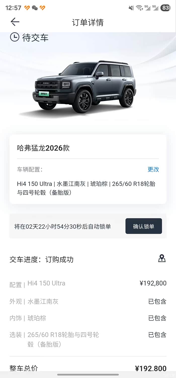 考虑到内蒙的用车环境,就想换个四驱SUV,预算有限,而且很认同长城这个品牌,老板不浮夸,很务实,造出来的车肯定不会太差,所以刚开始看了哈弗枭龙,感觉还不错,逛车友圈看有人不如上猛龙,我就顺便去看看,结果一看就种草了,尤其是那个方盒子造型,而且还可以选装265的大宽胎,还有全尺寸的备胎,这些都甚得我心,然后就开始研究配置,对比了又对比,pro版比ultra版,觉得有后锁出去野的上限更高;电池磷酸铁锂对比三元锂,感觉磷酸铁锂更安全;有智驾对比无智驾,对我一个老司机来说,还是把方向盘握在自己手里更放心。加上想要国庆前提车,所以就没纠结,直接定了Hi4 150 Ultra版,选装了江南水墨灰的车漆和最喜欢的R18 265 60的大宽胎。