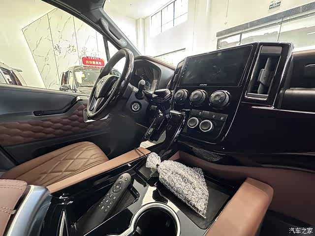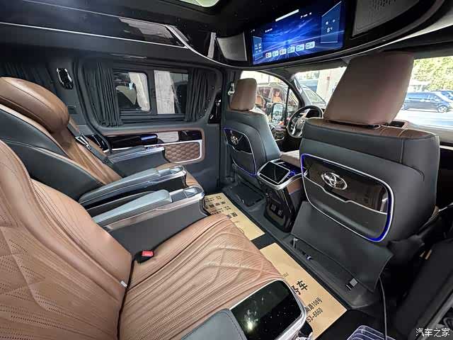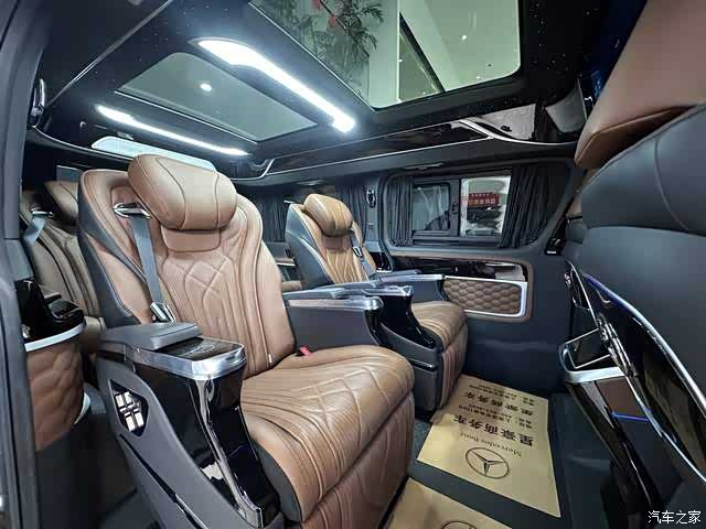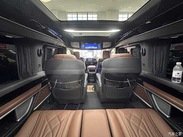 主要它是它的内饰,内饰是一个非常耐看而且说非常经典的配色棕灰的一个搭配,二排航空头等舱真皮座椅通风,加热,按摩,旋转也是应有尽有的。空间的话也是相当的够一米八的身高而且说现在天冷了棉袄也都穿上了,坐进这台车相当舒适前面是一个可开启的一个大天窗,后边是一个不可开启的天窗然后周边星空顶点缀包括的氛围灯中间还给客户做了一个阅读的一个顶灯应有尽有的。
