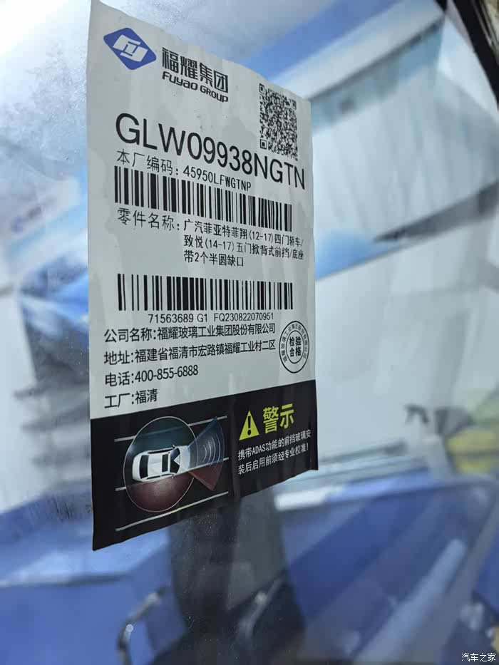 3. 新前挡玻璃-福耀玻璃(三张图片依次为:全览,商品标签,玻璃上的标记)