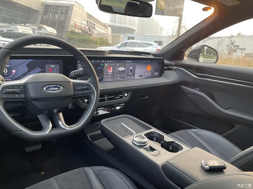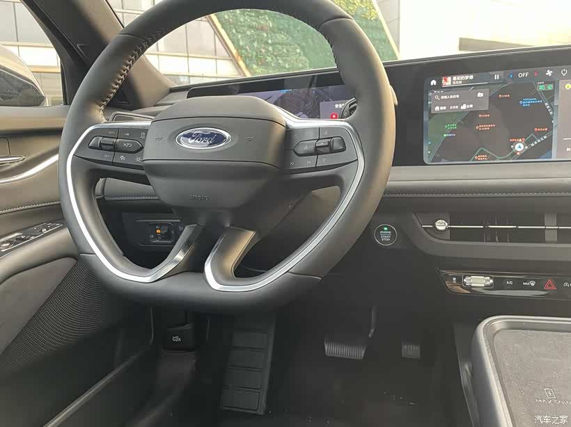 这块大屏给了我一个小小的震撼,在传统油车上居然能见到比电车还大的屏幕。而且也有8155芯片,能连CarPlay,支持语音分区唤醒识别,坐在后排也能说“你好福特,打开空调”,流畅度不亚于电车车机。