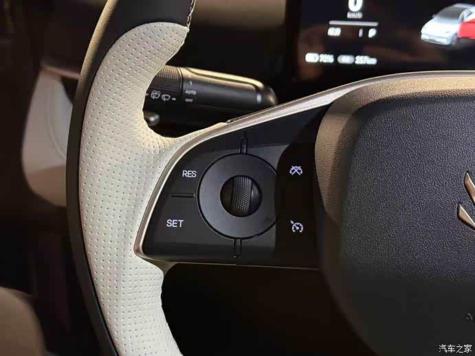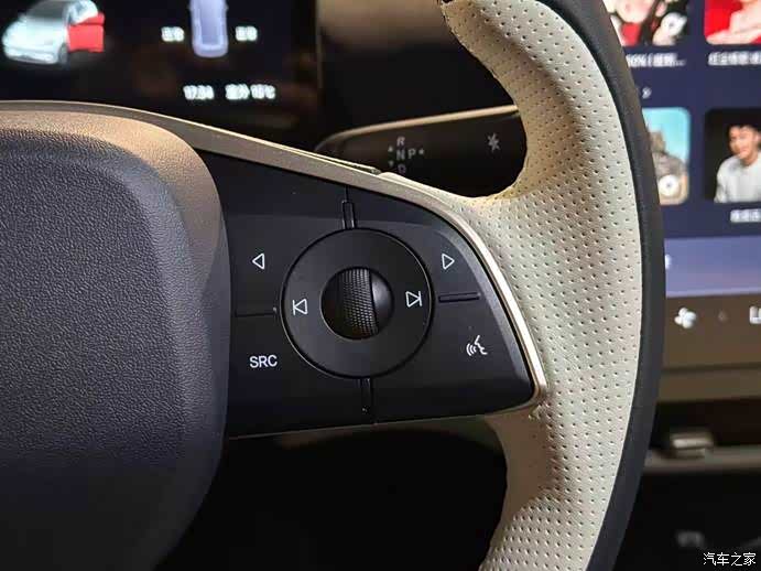 方向盘上的多功能按键,左边是定速巡航的控制,右边是音乐播放和语音控制的物理按键,方向盘两侧还使用了打孔皮的材料,可以有效增加手部摩擦力,拼色的皮料档次感也会更高。