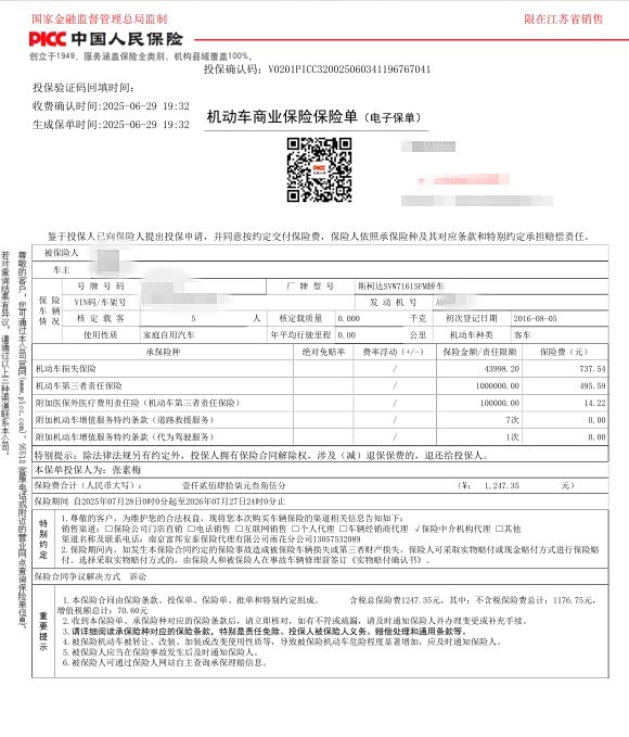 2025年还是买的人保车险。机动车损失保险737.54元,100万的机动车第三者责任保险495.59元,附加医保外医疗费用责仟险(机动车第三者责任保险)14.06元,交强险665.00,车船税:300。车险费用合计:2212.35元,没有优惠,赠送道路救援服务7次,代为驾驶服务1次。