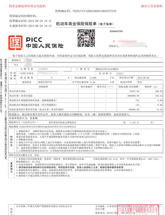 2024年买的人保车险。机动车损失保险774.63元,300万的机动车第三者责任保险720.91元,附加医保外医疗费用责仟险(机动车第三者责任保险)19.06元,交强险665.00,车船税:300。车险费用合计:2479,车险优惠完1900元,赠送道路救援服务7次,代为驾驶服务1次。