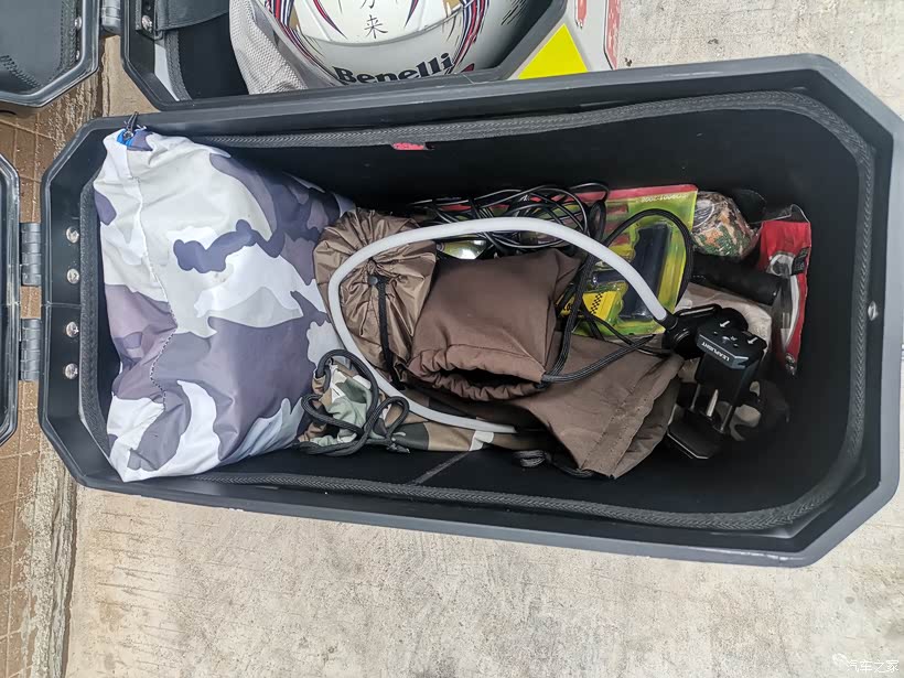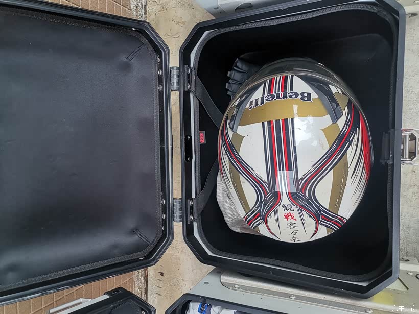 尾箱就只能装头盔,还有手套了,短途自驾游骑行的时候就会放点零食和水。