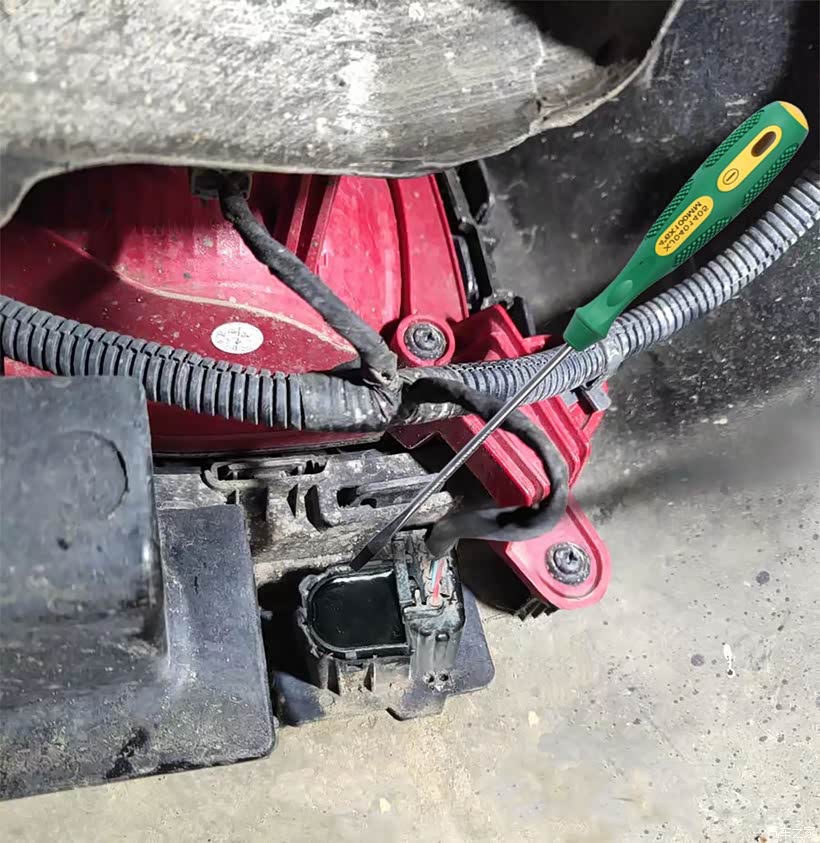 一只手照明,一只手用一字螺丝刀先把下部固定卡子这里撬一下,很容易的就离开卡槽了。