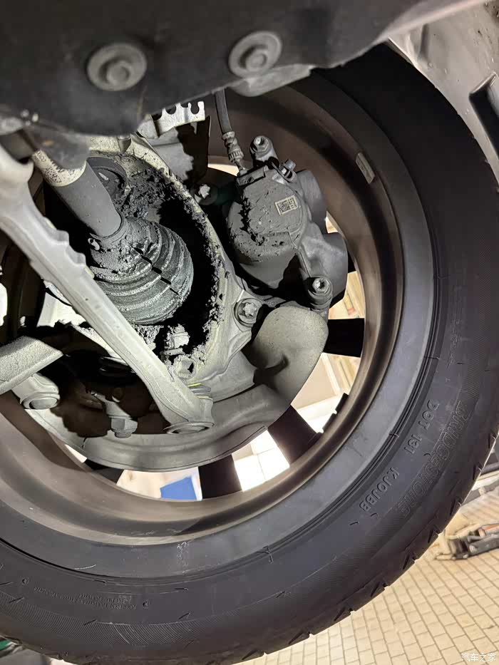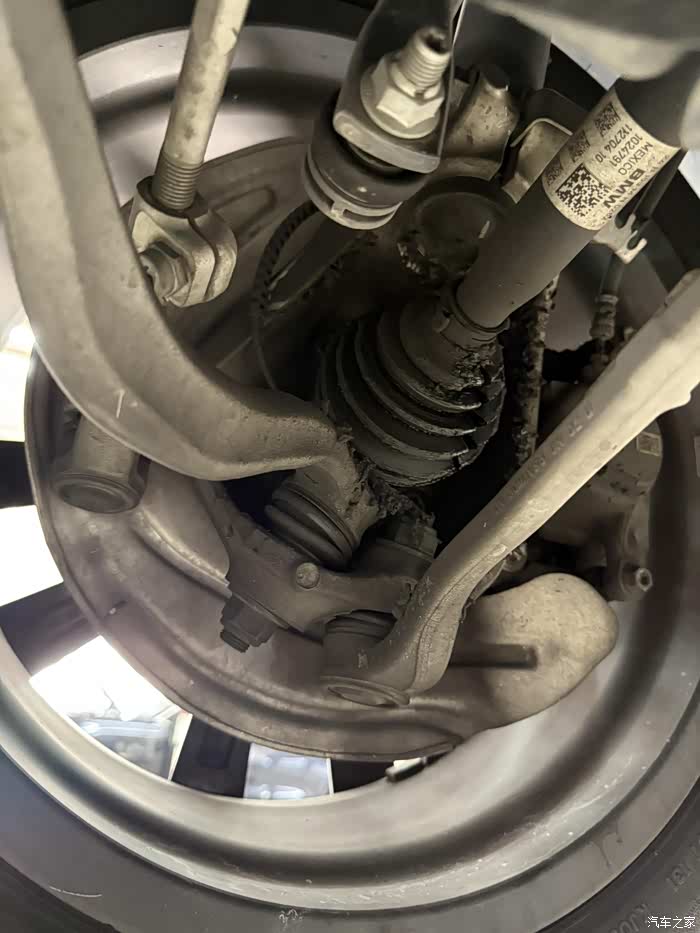 今天去常州的4S做了检查,我也跟着去车间看了一下。师傅把车子升起来一看,震惊了,说是从来没见过这种情况,整个防尘套纵向开裂。里面的油甩的到处都是。师傅看了一下防尘套四周,并不是接缝处开裂(一个防尘套有两条接缝)。这感觉就是从内部“炸裂”一样。