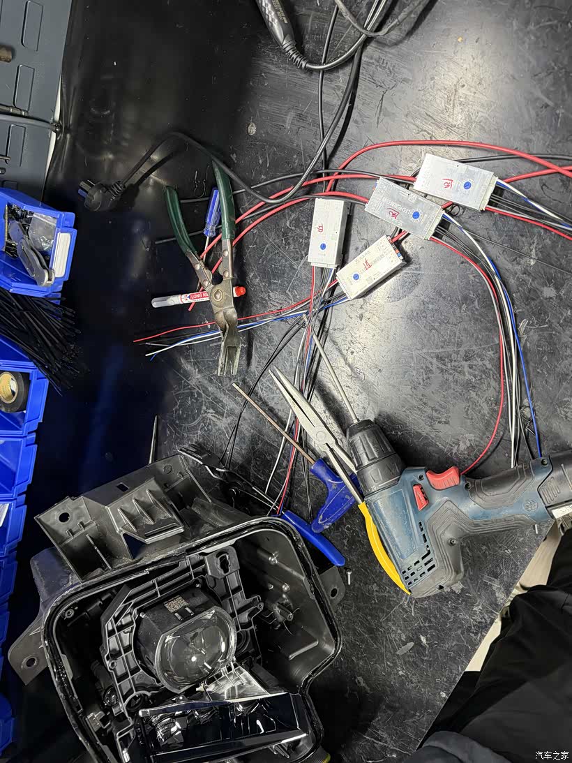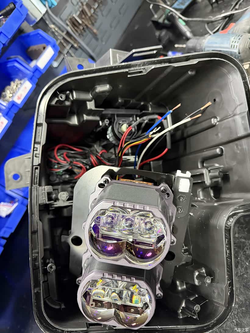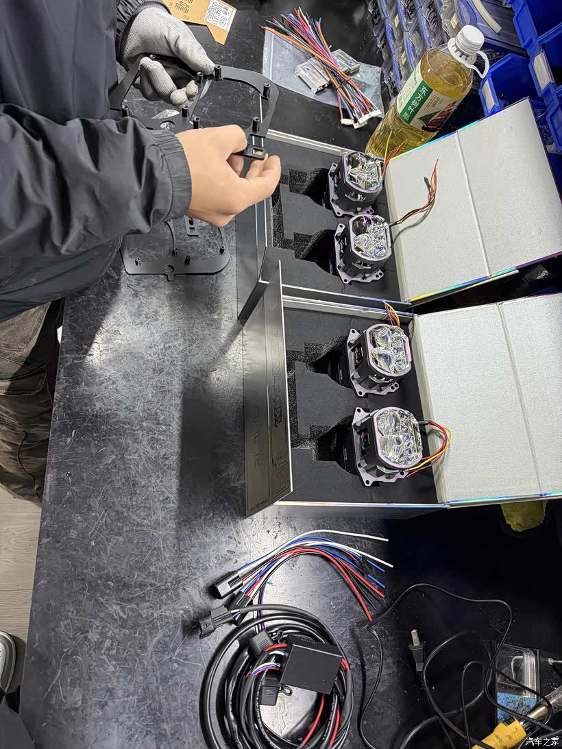 大灯的线组,选择拉线供电。因为2套透镜满功率400W,还是单独拉供电线安全,但是大灯要打孔