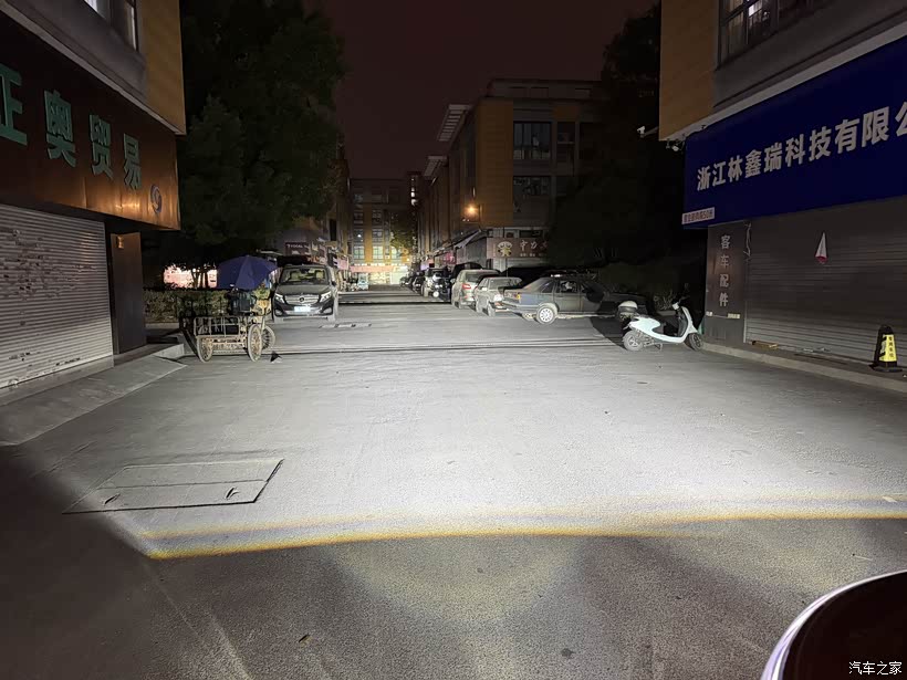 近光场景:郊区没路灯的路口,原厂灯只能照50米,现在巡洋舰照亮200米外,路边行人、野猫野狗看得清清楚楚;