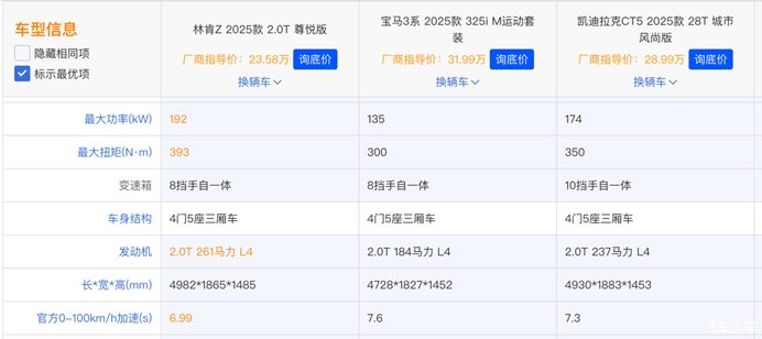 最近在20万级别里选车,本人比较注重动力表现,喜欢加速快的,这种要求最简单粗暴的方式就是买电车,我也真的去看了几款20万级电车,静态真不错,有颜更有料,但开起来总觉得不太对劲,电门响应过于直接,动能回收的拖曳感明显,驾驶感受上还是不太习惯。想想还是选择传统老品牌吧,质量成熟可靠,调校也有经验,于是重点看了林肯Z、凯迪拉克CT5和宝马3系,这三款都是2.0T发动机,动力基础都不错。