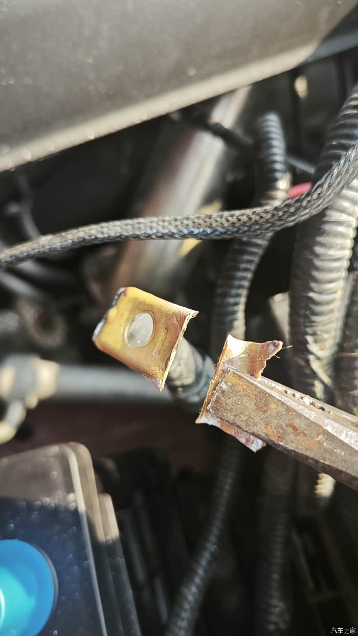 找前面那家骆驼电瓶店买了一个通用的端子把原车因为腐蚀断掉的接头位置直接拧断,扩孔上图那个圆孔。