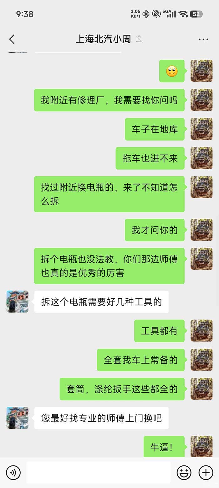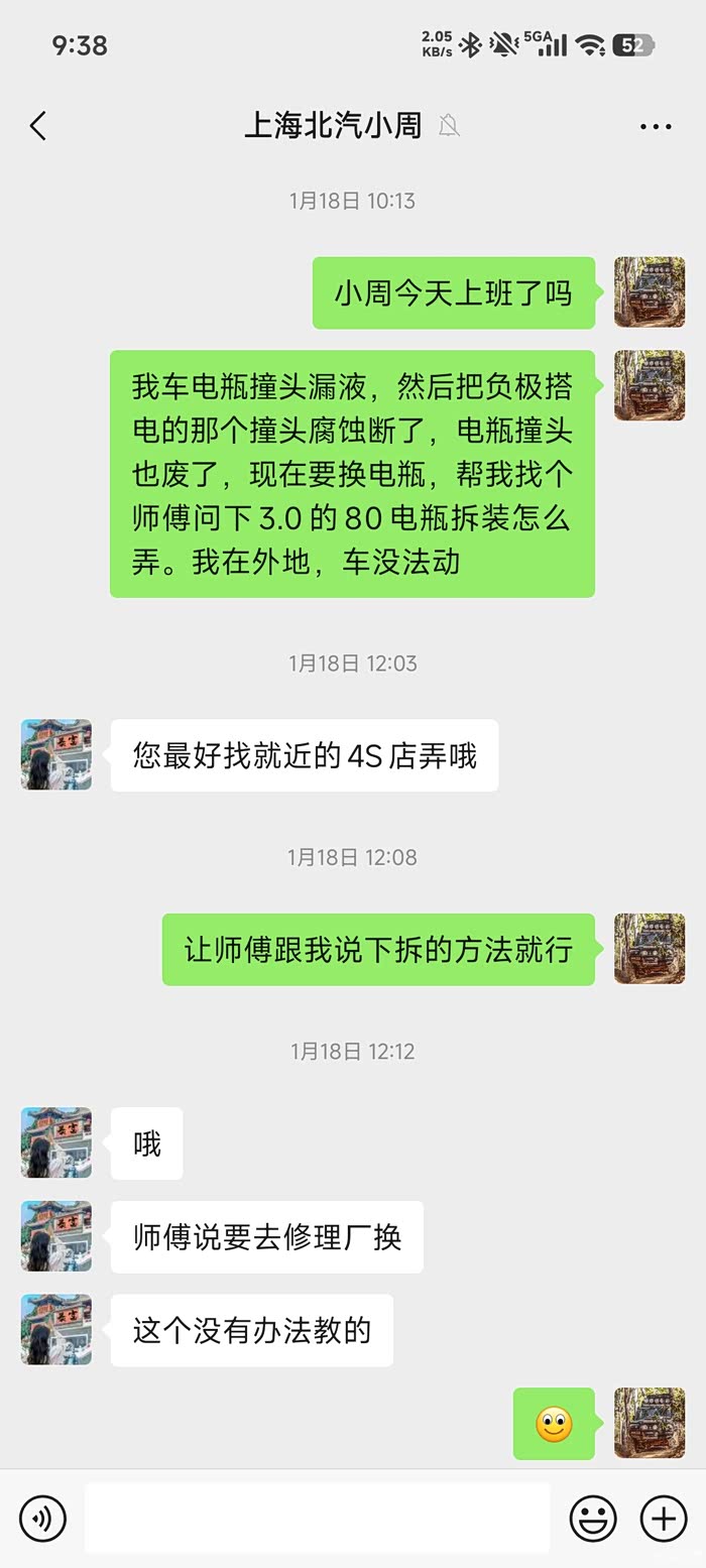第一时间是电瓶出这个问题,也用了两三年,就换个电瓶就好了,也不是什么大事,正常损耗,当时所在的酒店附近最近的北汽ssss距离有个二三百公里,我自己也一直玩车,电瓶一般就找个路边店换掉就好,就酒店附近找了个骆驼电瓶的门店,让老板带着电瓶来酒店换,我本着抓紧解决这个事情,然后回房间休息,这样不影响第二天的行程(当时已经是块晚上9点多),结果骆驼店的老板带着电瓶来了以后摸索半个小时没给80的电瓶拆下来,我自己也看了下常规电瓶是电瓶中间位置有个横杆固定,拆掉就可以取下电瓶更换,结果80没有这个横杆,看了半天没找到怎么拆。本来想当时就联系下上海的ssss问下怎么拆,但是看时间已经很晚了不想打扰ssss那边员工休息时间,就想着第二天再说,付钱买下电瓶,第二天再说。