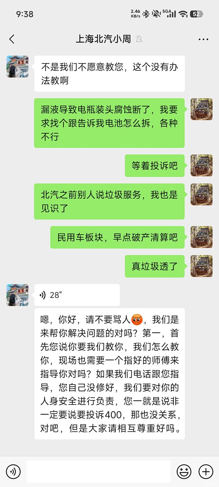 最后就是北汽ssss一直电话问我怎么才能撤销投诉,包括被我投诉的那个小周,最后也来跟我道歉,但是大家都是成年人,电话里面跟车主道歉,电话挂了骂车主这种事情毫无意义,售后主管问我什么诉求,我原话:“没有任何诉求,这个投诉也不会撤销,你们内部处理就是处理了,不处理我也无所谓,希望以后能想车主所想,我都能不在下班时间打扰你们,你们上班时间就做点该做的服务就好。”