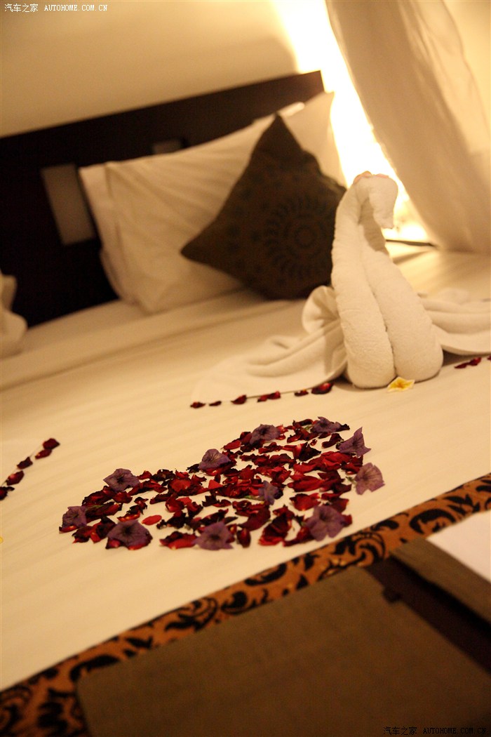 很有爱心的把我们的浴巾叠成了两只天鹅,床上的花瓣已经有些许枯萎,但不难看出它们在这里已经等候了我们一整天。
