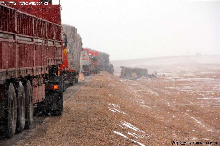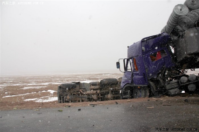 前行5公里后,突遇鹅毛大雪,并且前方出现堵车。插空钻过去一看,一辆大车翻下了路基