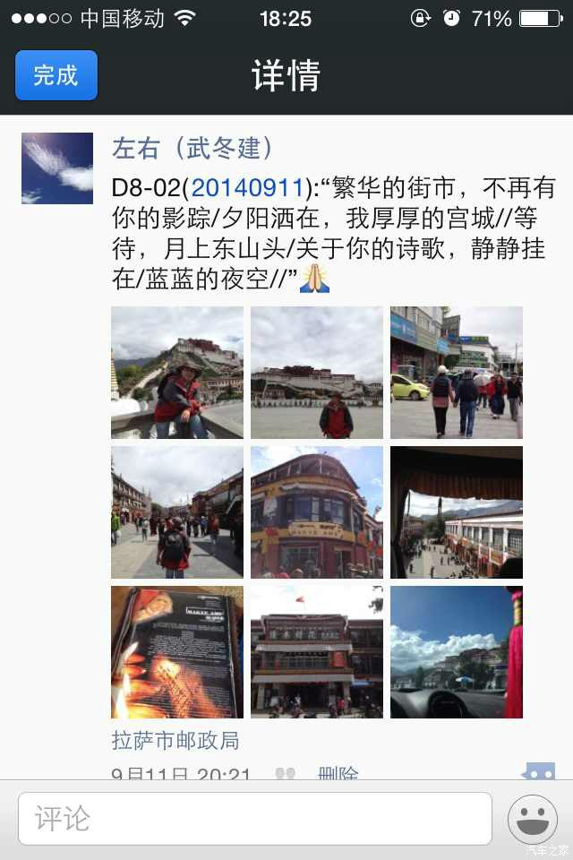 D8-01(20140911):“很久没体会到沾床睡,而且是让鸟鸣声叫醒。拉开窗帘看到的竟是环绕的雪山,感谢上天的眷顾,这带给我今天第一份好心情。酒店不错,停车场居然还有特斯拉的充电桩…相比武小萌的刹车真空泵在高原路况带给我的一路纠结,只能感叹差距就是差距啊!拉萨4s店的朋友也解释了这车就这样,不过能动感十足、轻灵飘逸的一路走来,且只是付出很小的代价就冲过了通麦天险,没让我掉进雅鲁藏布江里清洗灵魂,我仍然爱死这家伙了[呲牙]