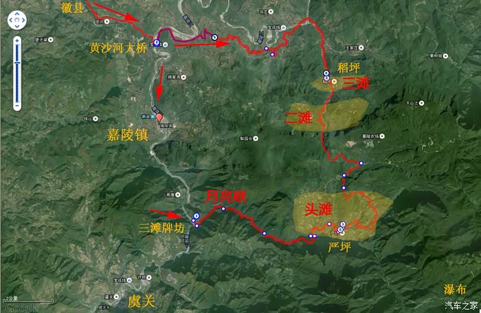 徽县到嘉陵过嘉陵江的黄沙河大桥,注意路标指向下桥可以到达稻坪! 稻坪村经考证是三滩景区的“三滩”所在。徽县政府在2015年投资17亿元打造三滩景区,包括路面硬化。 可惜至今查不到一个三滩景区示意图。 根据此次探查,参考驴友游记攻略,做一个示意图如下: