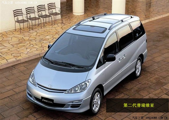 2000年1月丰田推出了第二代普瑞维亚,车型代号为ACR30W(两驱)和MCR30W/40W系。车身显得锋锐尖利,尺寸比第一代略微加长、缩窄了一点,轴距增至2900mm,车身的设计有了重大的变化,首先是不再采用MID中置后驱而改为FF前置引擎前轮驱动的形式;另外,发动机移到了车头,车厢内部的地板因此降低了高度,上下车更加容易,发动机的维修保养也方便了许多,原来的单侧门亦改为双侧滑门,有7座和8座的选择,后排座椅可作前后滑动,安全、舒适的配置比第一代大幅提高。ACR30W使用2.4升2AZ-FE增加了VVT-i的汽油发动机,动力增强了不少,但ACR30W只有FF两驱版;MC30WR和MCR40W分别指两驱版和全轮驱动版,都是之用代号1MZ-FE的3.0升汽油发动机,日本市场上还首次开始销售代号AHR10W的HYBRID混合动力车型,使用2AZ-FXE的2.4升汽油发动机配CVT无级变速的全时四驱系统。