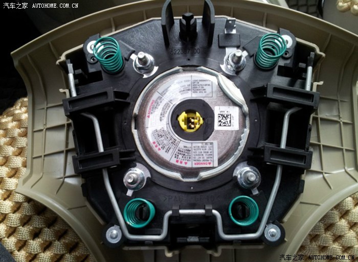 因为要拆气囊把电池负极拆掉,在边上有3个小孔,用一字螺丝刀先插进两边的小孔顶起弹簧把两边提起来,在顶下面的那个孔就可以把气囊整个拿出来了