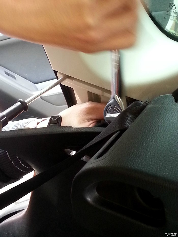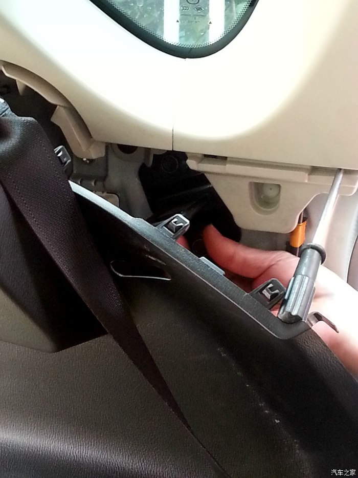 五、瓣开塑料壳的上部分,用十字起顶着塑料壳的上部分使其有足够的开口,这样就可以看到原车的卡扣了: