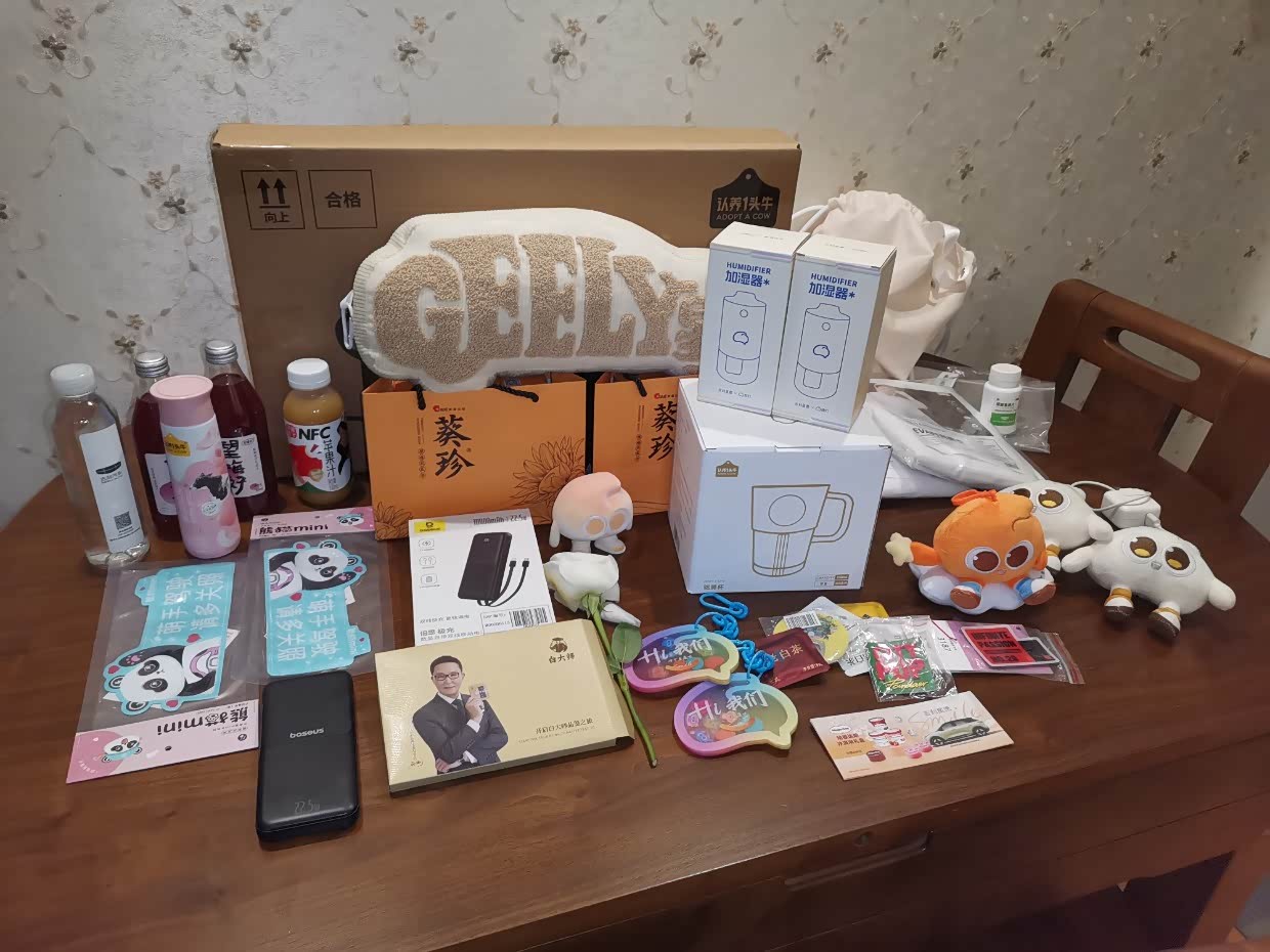 星愿发布会上的战利品,靠枕,各种玩偶,充电宝,加湿器,水杯,哈根达斯礼包等等,?还有几件衣服,没有拍出来,卫衣啥的,质量都挺好的。