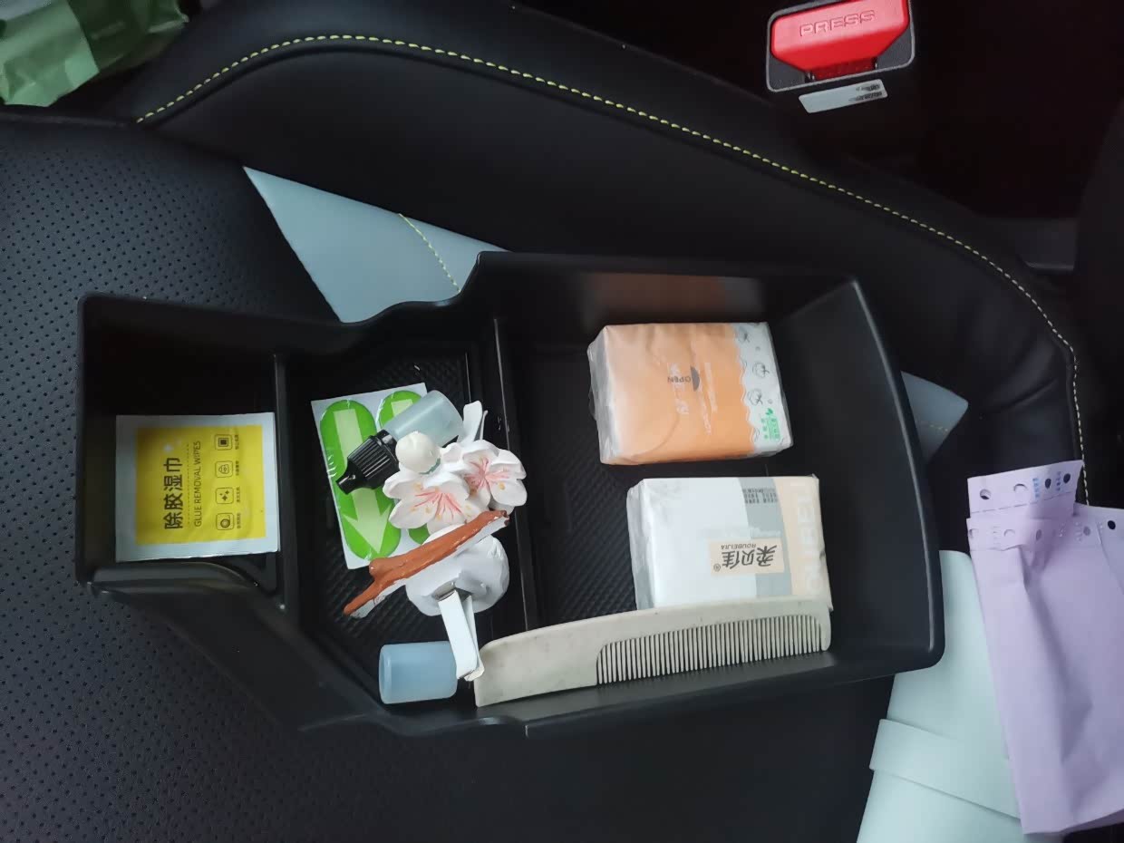 扶手箱的搁物板,平时可以把常用的东西放上面,而且可以分类放,这样扶手箱里面不会很乱。