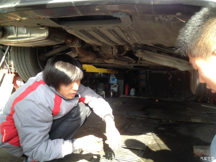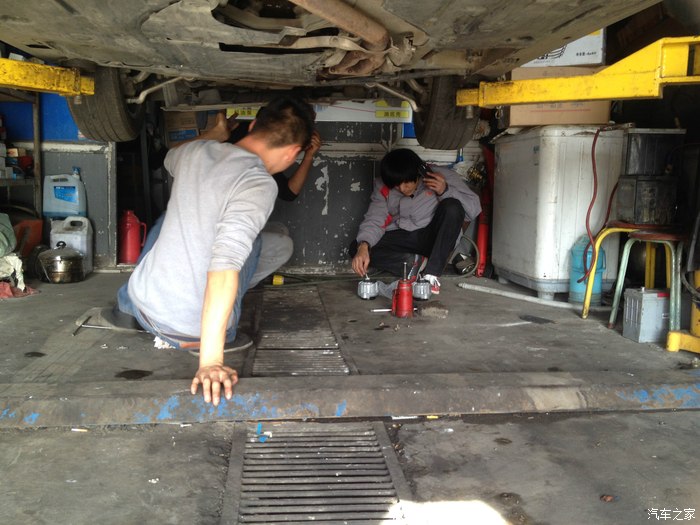 4.拆右边的机脚胶须要卸下三元的制震块,拆左边的需要松开底盘的拉杆架......辛苦哥俩忙活了好一阵子