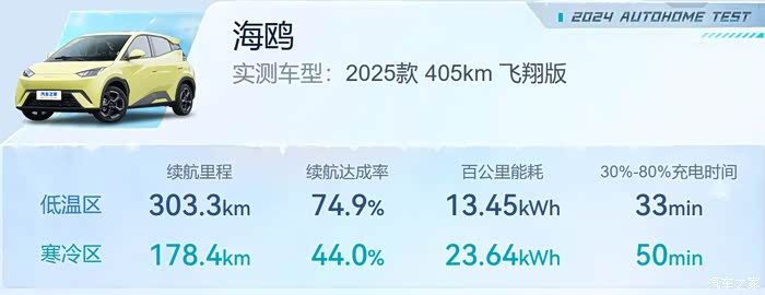 气温5°C至15°C的低温区测试中,比亚迪海鸥的续航里程达到了303.3公里,续航达成率为74.9%。这个成绩在同级别车型中表现较为优秀,在低温环境下的续航能力可以说还是不错的。