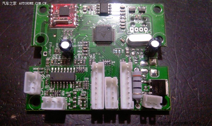 再来看一下集成电路板.集成电路板和屏板按键板是分离的,通过插排连接,方便分别固定.板子上那块红色的小板,是收音模块,用不到的东西,本想焊掉,,,,后来留着就留着吧,没有处理.右下角那个黑色的就是传说中的7805了.....12V转到5V,有点发烫,还好厂家在背面加了锡网散热,所以发热不是很厉害.