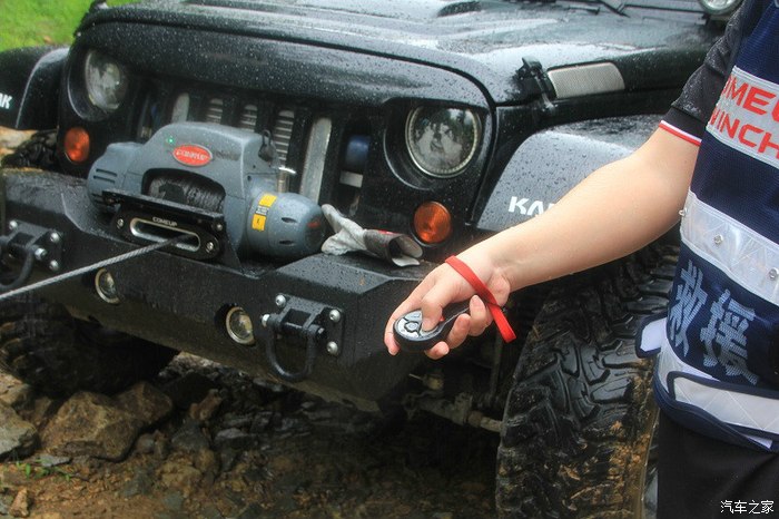 停车后拉上手刹,确保档位在停车状态,然后再下车收拾。拉住缆绳保持一定预紧力,用绞盘控制器慢慢回收,要让缆绳整齐地排布在轮鼓上。