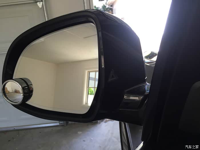 后视镜上有个小三角,旁边有车离得较近时会通过震动方向盘提醒。