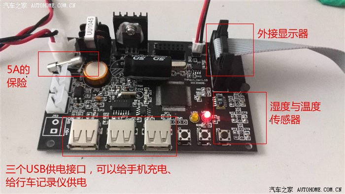 3、可提供五路5V电压输出,其中三路使用USB接口引出,可方便地接入行车记录仪和给手机充电