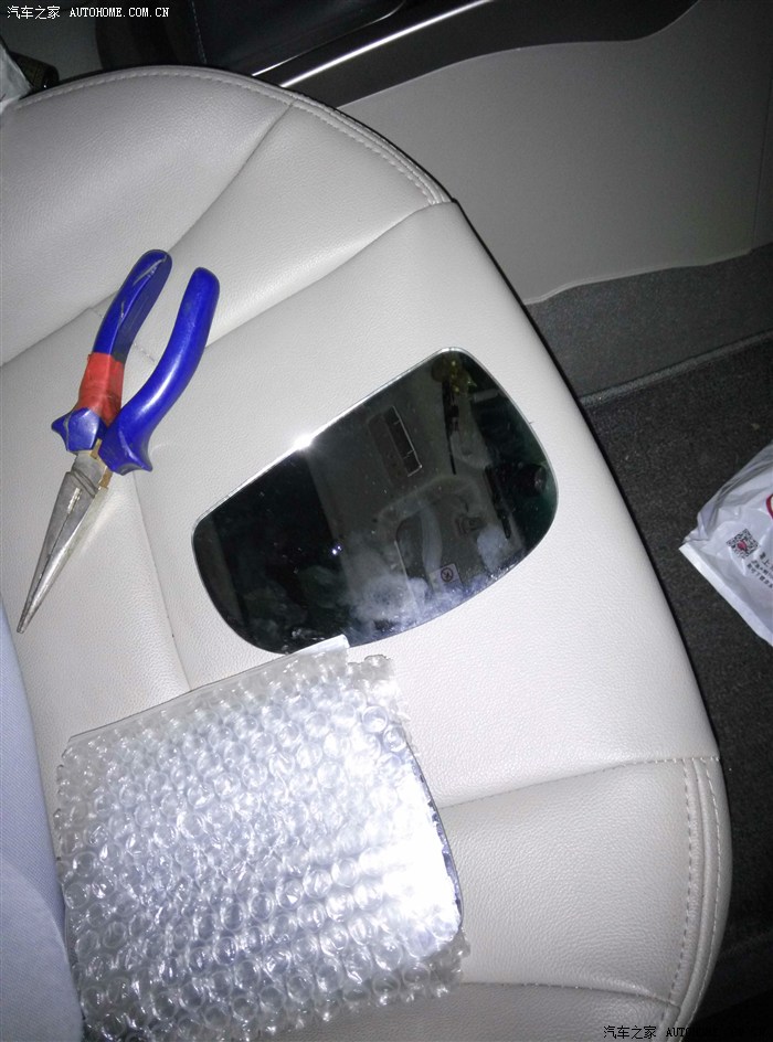 然后是从淘宝买来的大视野铬镜,自己换的。当心点,一般不会把玻璃搞碎的。取下时注意加热的2根电源线连着,当心拉断。拔下来即可。很紧的话,用尖嘴钳。安装上去后效果还行,视野明显变大,但是物体显示变小变远了,所以变道时要注意跟车距离和以前不同了。晚上防眩目效果一般。蓝光的这点很好,可惜晚上太暗了点。