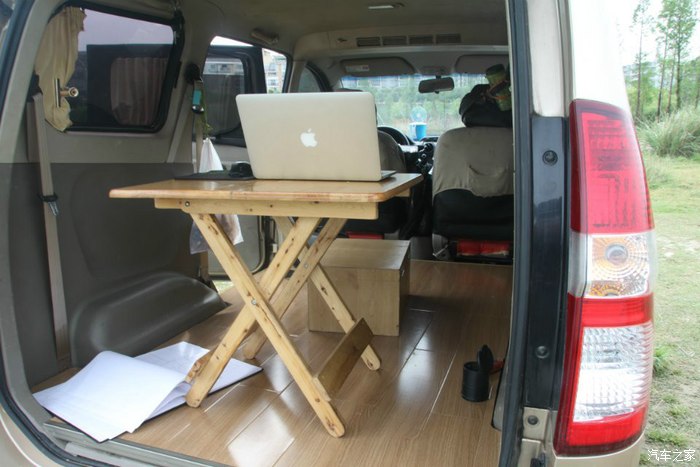 一张活动木桌,一个杂物箱,一台电脑,这里就成了我的办公室,所有的行李和卧具都可以放在车顶行李箱内(2.2米×0.97米×0.38米)。电脑电用完的时候,直接开发动机给电,两个小时内(每小时7元钱)一边用一边充可以充满。充满后便可以用6小时了。