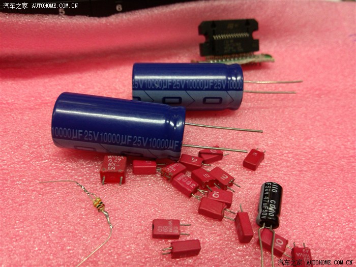 好了~接下来要看我准备的发烧级配件了哦!各位观众...4x50W保真汽车音响功放IC TDA7850,我用的是原装拆件,MLT生产而不是CHN的Made-in-China(shanzhai)正品3,5脚电阻3k左右,德国威马 MKP系列 63V 0.1uf(100nf 104)薄膜电容,数字立体声音频控制IC TDA7313,电解电容 25V10000uf 体积18*35