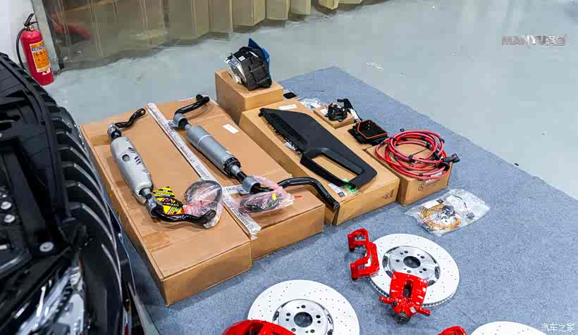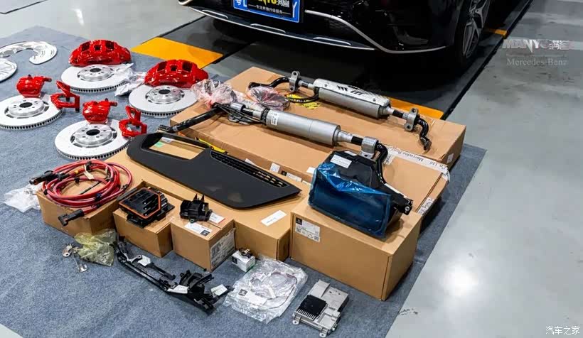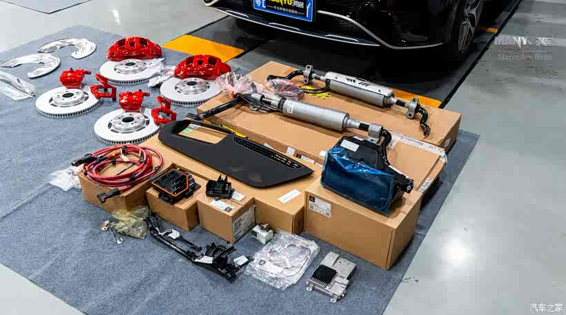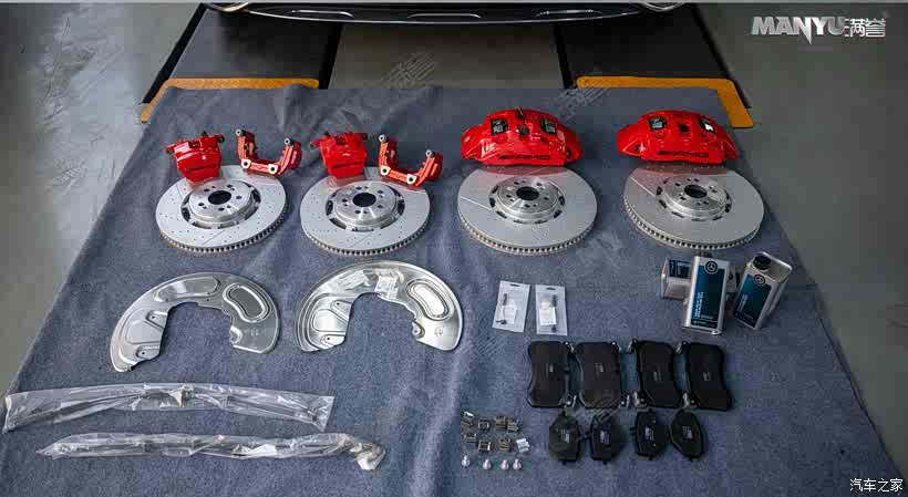 ▲ 配件清单:原厂AMG前六活塞、原厂AMG后单活塞、原厂刹车盘、后卡钳支架,前护板,油管,TRW刹车皮,原厂刹车油