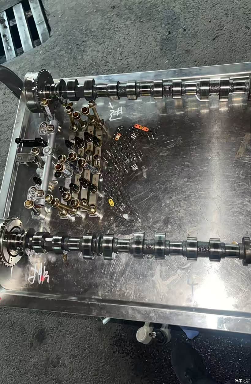 拆下的进、排气凸轮轴和支架,在工具车上做好标记,正时链条等部件,
