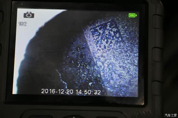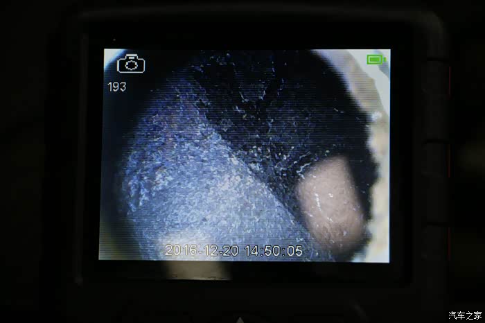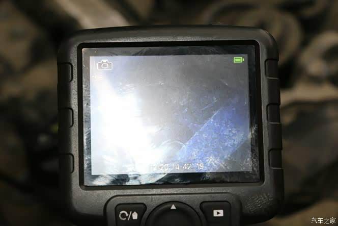 为了了解发动机内到底有多少积碳。让师傅用工业内窥镜看一下。就上图这个,看起来还挺高级,跟医院的胃窥镜似的。这是内窥镜拍到的活塞顶部,看起来油乎乎的,积碳还真不少。
