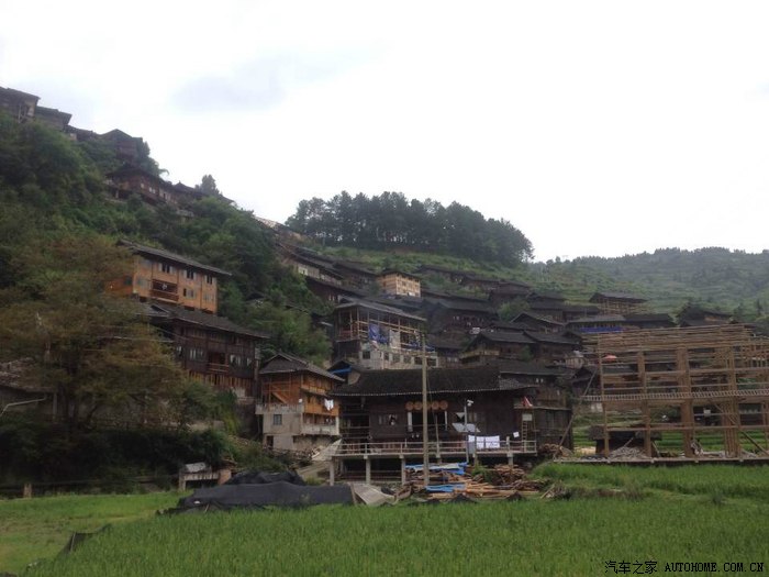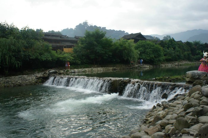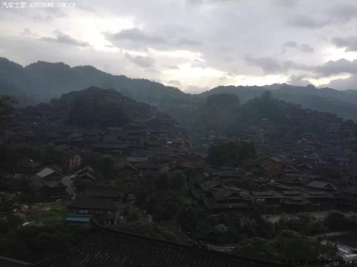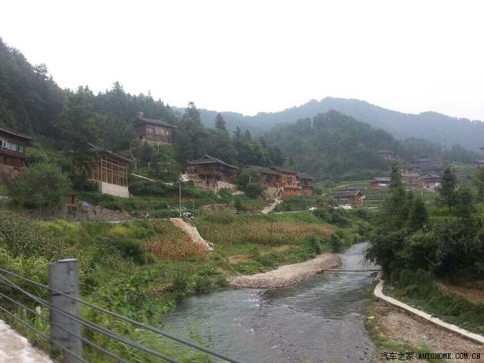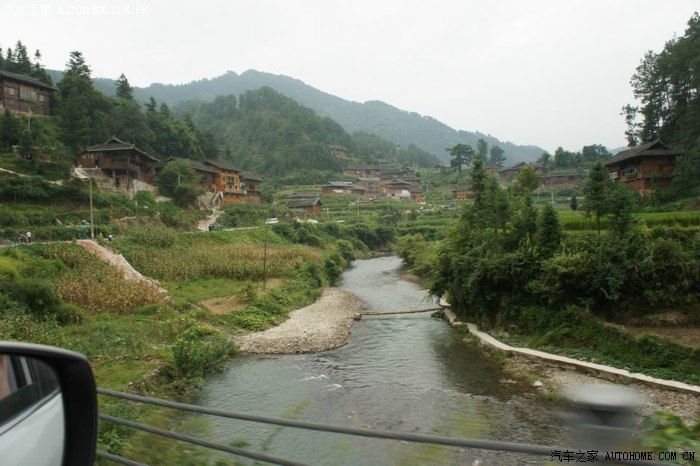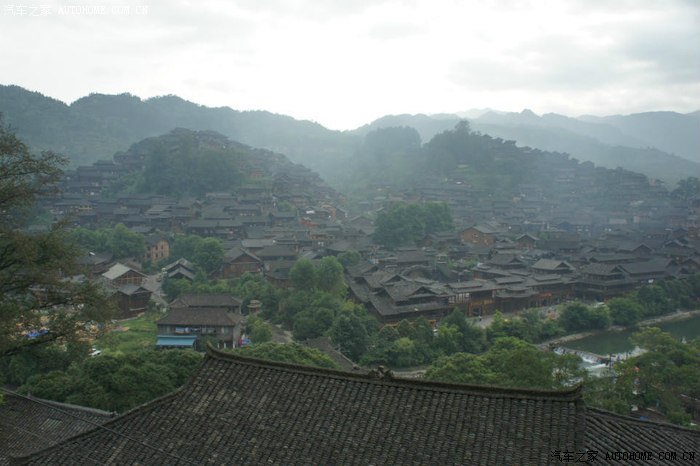 离开喧闹吵杂的城市,走在去苗寨的山路上,有如进入世外桃源的感觉,空气清新,满眼葱绿,流水潺潺,大家都赞叹景色真美。晚宿苗寨,住的宾馆正好可以拍摄出西江苗寨的全景——牛头状。