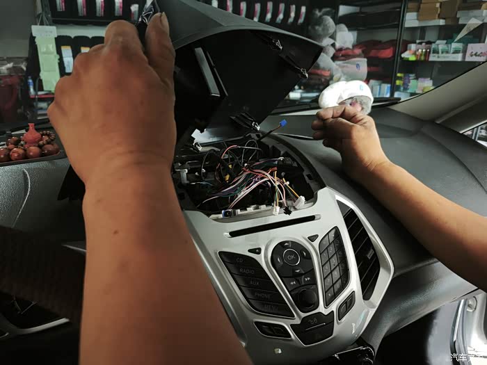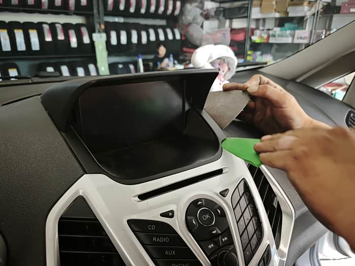 既然是换新,那就省略了检测、诊断的步骤,直接拆旧屏换新屏吧。先把撬板插入原车大屏缝隙,将前、中、后的六枚卡扣撬开。