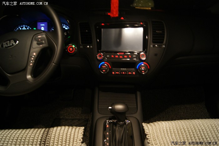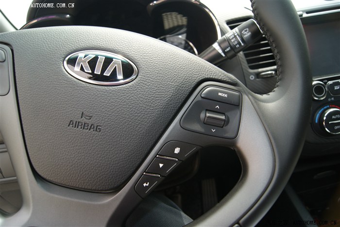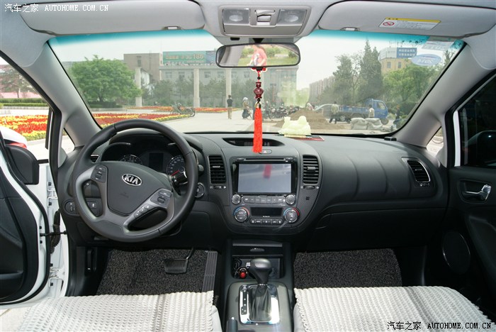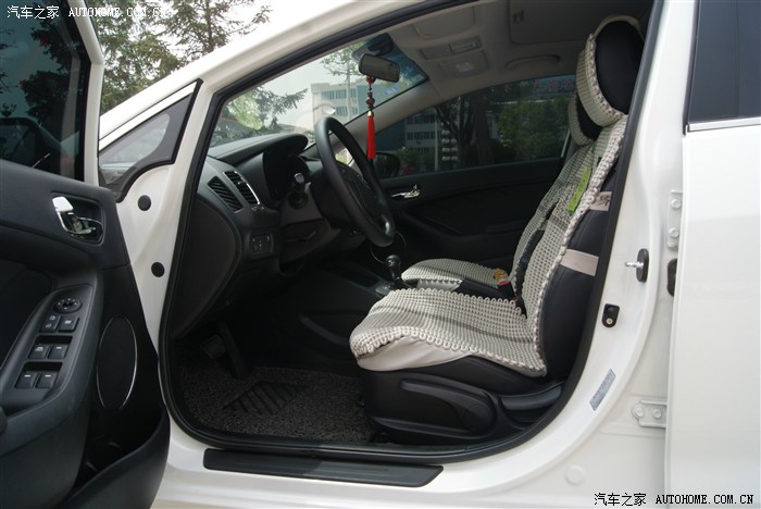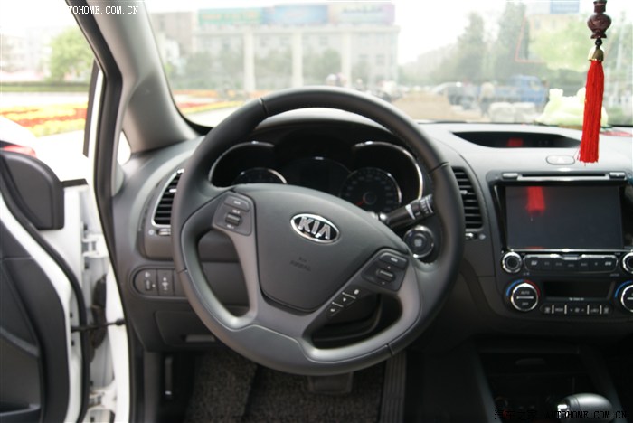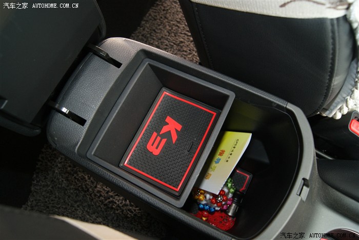 9、内饰:K3的内饰设计显得很低调,没有多少一眼就能引起人注意的部分,但无论是在用料、做工,还是在细节、实用性等方面,都是比较厚道和贴心的。真皮方向盘造型不错、手感很好,仪表盘信息丰富。中控台上的液晶屏可以显示时间和室外温度。四个车门上的扶手很软,靠起来很舒服。内饰总体满意。