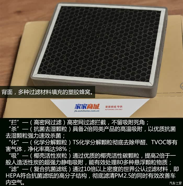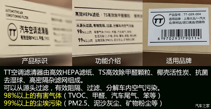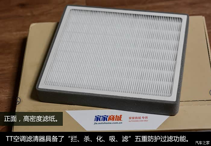 所以选择一款好的空调滤清器就尤为重要了,这次试用的TT空调滤清器以“拦、杀、化、吸、滤”五重防护从源头隔绝车内污染,能够达到99%PM2.5阻隔,98%甲醛去除,98%TVOC净化,大幅度改善车内的空气质量。好了再说就是废话,上图。