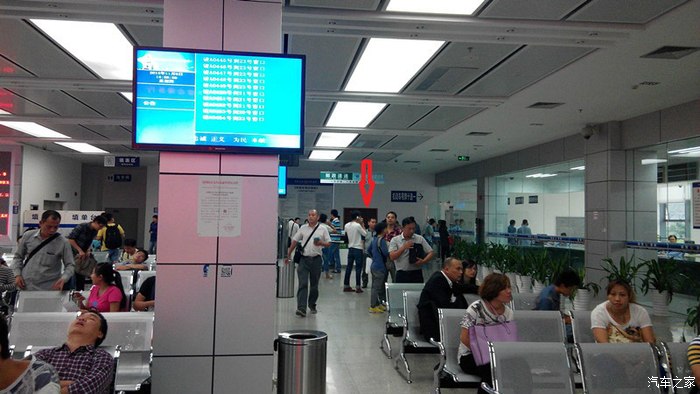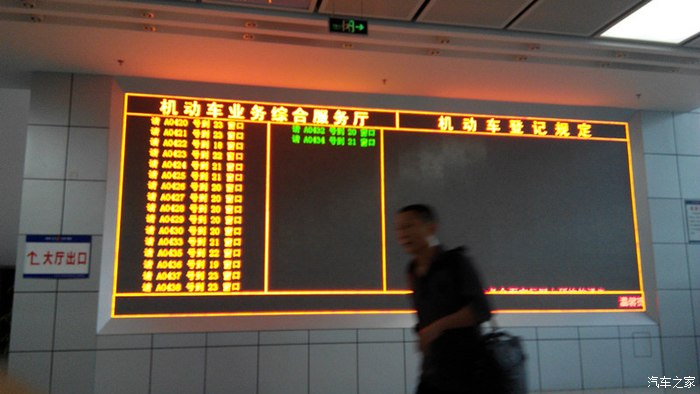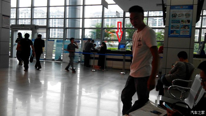 再到左手边那个大厅,写着机动车业务的,前面有个取号的,把资料给他,说刷完卡了,他会给你取号,下图箭头所示