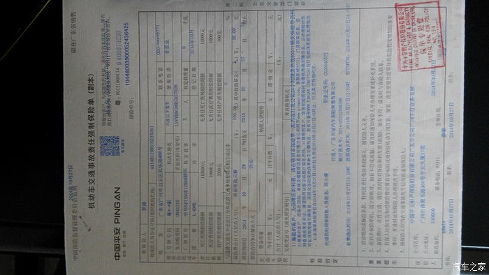 我的交强险和商业险都是同一家买的,在广州买的,事先自己选好险种和保额,刷卡然后就会打一堆单据和发票给你,其中交强险保单就是其中之一,后面上牌要给车管所的那联见下图