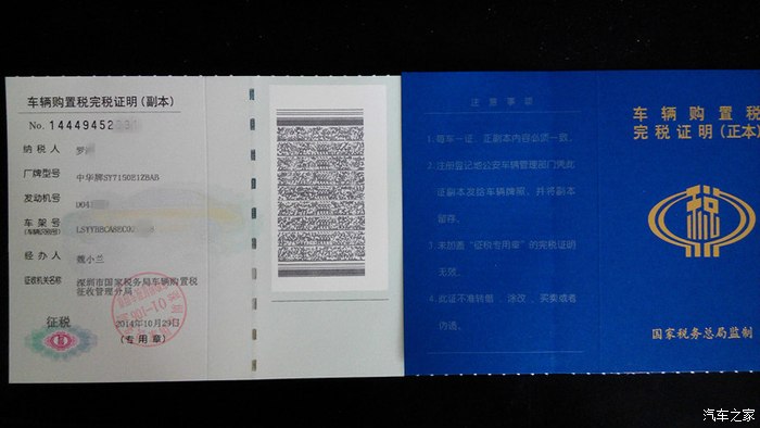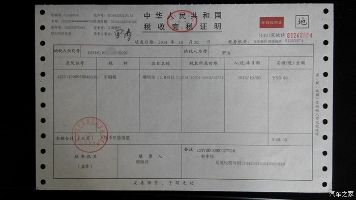 我在观澜地税所办的,貌似窗口好像很多有车主来给新车上车船税的,那窗口办事帅哥不知道要什么资料怎么上,又问了一个年纪稍大的,一开始说让我交2014年全年车船税,我说新车10月的发票,2014应该只用交最后三个月的了,然后他哦了一下,刷了我三个月90元的车船税。还好哥是做财务的,差点又给坑了。深圳这边车船税是每个月30元,一般是按年征收的,当年不满一年按剩余月份来征收。好了,车船税完税证明也有了。