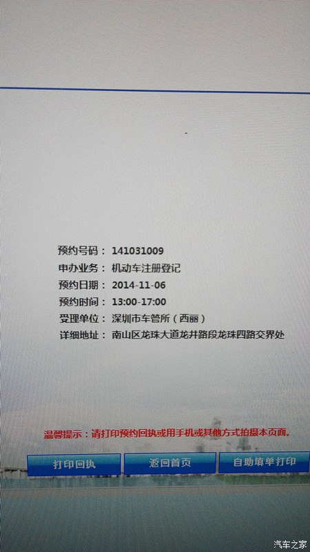 回到深圳第一件事当然就是网上预约车管所的业务了,上面说到我之前有预约到30号的龙华车管所上牌,出现小插曲就是去了那里被告之外地买的车那里上不了牌,得去西丽车管所上。后面我咨询了深圳车管所的微信,还有网上车主的一些贴子也证实,异地提的车由于发票系统联网问题,最好是去西丽新车管所上,以免白跑是小事,浪费了时间就是大事。西丽车管所的预约号那是相当紧张,提前放5个工作日的号,也就是说你预约的最快的也是一个星期后才能去上牌,所以我说广州的临牌用处相当大的,15天有效期够用了。没办法了,30号那天白跑回来立马去网上预约,结果发现到11月5号的西丽都没号了,真是火爆呀,咨询车管所微信,说是每天晚上12点一过准时放第二天的号,我就在电脑前挨到12点,立成预约果然6号的号开始放号的,果断填资料申请,预约的下午,时间比较充裕,成功预约,手机拍照以备用。(PS:车友发现没号的话当天晚上12点就不要想早睡了)