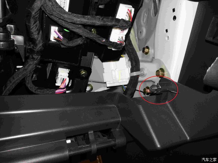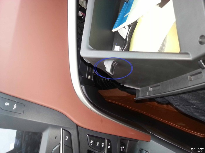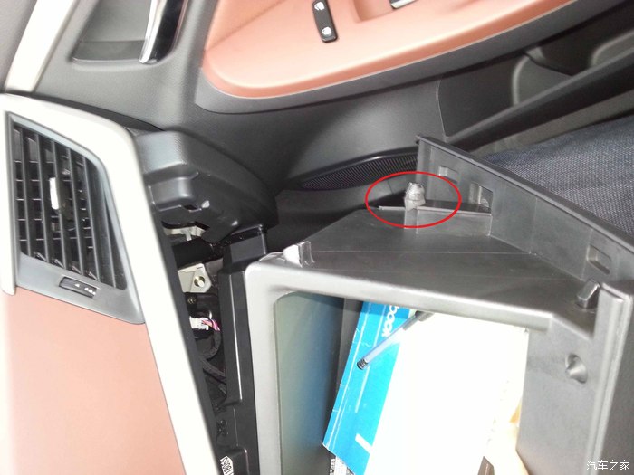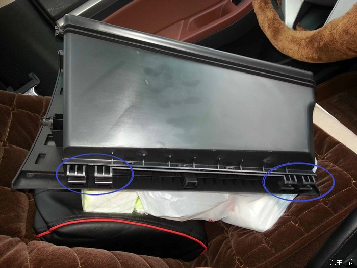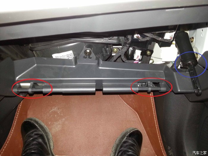 蓝圈部分是手套箱的挡脚,右边也有一个。脱开四个扣脚后这两个挡脚是卡在中控上的,你需要左右移动才能把整个手套箱拿出来。